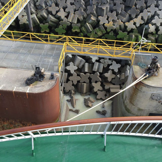 At the ferry dock, there is a cluster of concrete shapes. They look like letter press glyphs, rubber stamps inked up with a green seaweed colour or lengths of extruded clay.